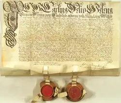 Das Wappen von 1649 ist geviert und belegt mit einem silbernen Herzschild, darin drei rote Pfähle, überdeckt von einem schwarzen Balken (Stammwappen), 1 und 4 in Gold einwärts-gekehrt ein geharnischter Arm, einen Streitkolben haltend, 2 und 3 schrägrechts geteilt, oben in Schwarz ein wachsender goldener Greif, unten rot und ledig. Drei Helme: auf dem rechten mit blau-goldenen Decken der Arm mit dem Pusikan, auf dem mittleren mit schwarz-silbernen Decken ein offener, wie der Herzschild bezeichneter Flug (Stammwappen), auf dem linken mit schwarz-goldenen Decken der wachsende Greif.