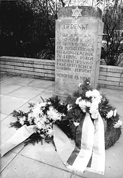 Am 18. November 1966 wurde zur Erinnerung an die jüdische Gemeinde und an die Zerstörung ihres Gotteshauses an der ehemaligen Nordfassade ein kleiner vom Leipziger Bildhauer Hans-Joachim Förster (1929–2022) geschaffener Gedenkstein aus Cottaer Sandstein eingeweiht.