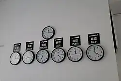 Gebetszeiten-Anzeige in der Moschee (von rechts nach links): Fadschr (Morgendämmerung), Zuhr (Mittag), ʿAsr (Nachmittag), Maghrib (Sonnenuntergang), ʿIschā (Abend), Dschumʿa (Freitag)