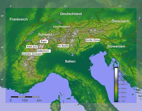 | Eiger | 1800 m | 3967 m | 1938 | Heinrich Harrer, Anderl Heckmair, Fritz Kasparek, Ludwig Vörg | 1961 Toni Hiebeler, Toni Kinshofer, Walter Almberger, Anderl Mannhardt | 1963 Michel Darbellay | 1978 Tsuneo Hasegawa und Ivano Ghirardini (einen Tag später) | 2015 Ueli Steck (2h 23m) |