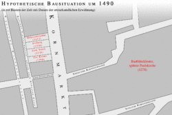 Als Baubeginn wird von der vorhandenen Literatur fast geschlossen das Jahr 1496 genannt, Anja Johann nennt, ohne Quellenangabe, 1497.[5] Zumindest die 1496 stützt sich offensichtlich nur auf eine Angabe im zweiten Teil der Frankfurter Chronik von Georg August von Lersner,[6] dessen Aussagen in Anbetracht der geschichtswissenschaftlichen Standards im frühen 18. Jahrhundert zumindest kritisch zu hinterfragen sind. Gemessen an anderen, urkundlich besser dokumentierten Bauprojekten jener Jahre, etwa dem Steinernen Haus, erscheint eine Bauzeit von zwei Jahren jedoch realistisch.