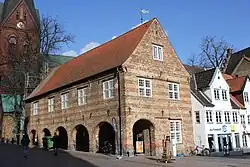 - Große Straße 75: Das Haus stammt aus dem 17. Jahrhundert,[110] doch offenbar wurde damals der Dachstuhl von einem anderen Haus, möglicherweise dem Vorgängerbau der an dieser Stelle stand, wiederverwendet. Das Eichenholz des Dachstuhls soll nämlich, wie spätere wissenschaftliche Analysen ergaben, ursprünglich ziemlich exakt im Jahr 1431 verbaut worden sein. Es handelt sich somit um das älteste Dach der Stadt.[111]