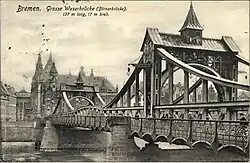 Wenig später entstanden flussabwärts zwei weitere Weserbrücken. Die 1865/66 erbaute Eisenbahnbrücke konnte nicht von Fußgängern genutzt werden.[8] Von 1872 bis 1875 wurde für den großen, neuen Straßenzug vom Hauptbahnhof in die Neustadt die Kaiserbrücke errichtet, heute Bürgermeister-Smidt-Brücke.