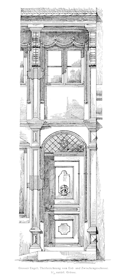 Das von den vorgenannten Knaggen gestützte Gerähms ist mit Schnitzereien geschmückt, die an einen antiken Triglyphen-Fries erinnern. Umgeben vom Renaissance-Rollwerk erblickt man hier in den Metopen verschiedene fratzenhafte Maskendarstellungen; sie wiederholen sich in Kielbögen über fast allen Fenstern des Großen Engels, insbesondere an der zum Römerberg gewandten Seite. Einzig über den Fenstern am Erker in Höhe des achteckigen Aussichtstürmchens befinden sich am ehesten an Kleeblätter erinnernde Stürze.