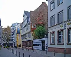 | Blick von der Ecke Weißadlergasse, in der Mitte das Goethe-Haus, links davon das Deutsche Romantikmuseum und die Goethehöfe mit Volksbühne (der ehemalige Sitz des Börsenverein des Deutschen Buchhandels) | |