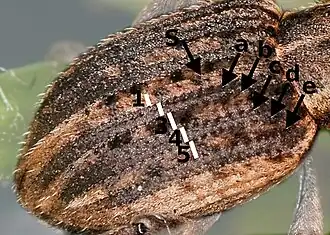 | Abb.1: Flügeldecken, rechts teilweise Halsschild 1, 2, 3, 4......: erstes, zweites, drittes,… Intervall S: Flügeldeckennaht; a,b,c,…: Punktreihen | |