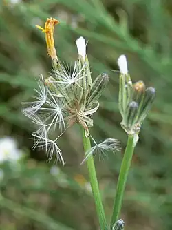 Die Achänen sind gerippt, 8 bis 9 Millimeter lang mit ebenso langem Schnabel; die Oberseite ist höckerig. Der Pappus ist mehrreihig und daher stielartig hochgehoben mit einfachen oder kurz gezähnten „Strahlen“. Am Grund des Pappus sitzt ein Kragen aus fünf spitzen Schuppen.[1]