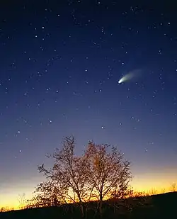 - Der Komet Hale-Bopp konnte 18 Monate lang freiäugig gesehen werden, länger als irgendein anderer Komet. Über 215 Tage war er heller als 3,4 mag. Um den Zeitpunkt seiner größten Annäherung an die Sonne am 1. April 1997 erreichte er eine scheinbare Helligkeit von etwa −0,7 mag, und seine zwei Schweife erreichten eine Länge von 30 bis 40°.