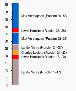 Hamilton fuhr dann allerdings doch in der 20. Runde an die Box und wechselte wie Norris auf die Hards. Er kam mit großem Abstand hinter Verstappen zurück auf die Strecke. Verstappen nutzte die schnelleren Reifen aus und schloss schnell auf Norris auf und überholte ihn in der 28. Runde.
