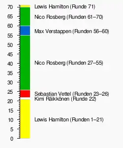 Rosberg und Hamilton verkürzten den Rückstand auf Verstappen und gingen in Runde 61 bzw. 63 vorbei. Ricciardo wechselte in Runde 63 auf Ultrasoft, mit denen er danach schnell auf Grosjean und Button aufholte und beide überholte. Massa schied in Runde 64 aus, kurz danach auch Alonso und Hülkenberg.