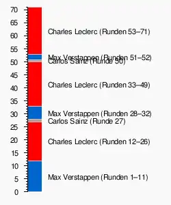 Währenddessen kam es innerhalb des Feldes immer wieder zu einzelnen Positionswechseln. In Runde 25 gab Pérez das Rennen an der Box auf. Einige Runden später kamen erst Leclerc (Runde 27) und dann Sainz jr. (Runde 28) schließlich an die Box, womit Verstappen wieder führte. Die Führung holte sich Leclerc jedoch schon wenige Runden später in Runde 32 zurück. In Runde 37 kam Verstappen zum zweiten Mal an die Box und kam hinter Sainz auf Position 3 wieder auf die Strecke.