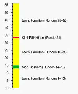 In Runde 30 kam Vettel erneut an die Box und wechselte nun auf die härtere Reifenmischung. Hamilton fuhr die bis dahin schnellste Rennrunde und konnte sich von Rosberg absetzen, der in Runde 31 an die Box kam. Hamilton fuhr zwei weitere schnelle Runden und wechselte in Runde 33 auf die härtere Reifenmischung, Räikkönen übernahm damit die Führung. Maldonado verbremste sich bei der Boxeneinfahrt und musste zurücksetzen, um in die Boxengasse einbiegen zu können. In Runde 35 kam auch Räikkönen an die Box und fiel wieder auf Platz vier zurück. Kurz darauf kamen auch Massa und Valtteri Bottas an die Box und wechselten auf die weichere Reifenmischung, der Rückstand auf Räikkönen betrug jedoch rund 30 Sekunden.