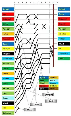 Stewart gewann das Rennen schließlich souverän. Sein Teamkollege Cevert komplettierte einen Tyrrell-Doppelsieg.[4]
