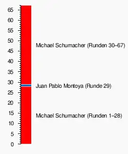 In Runde 29 gingen die beiden Führenden zeitgleich in die Box. Der Boxenstopp der Ferrari-Mannschaft war ein wenig kürzer, sodass Michael vor seinem Bruder wieder auf die Strecke herauskam. Montoya hatte währenddessen die Führung übernommen. Diese gab er jedoch in der darauffolgenden Runde wieder ab, da auch er zu seinem ersten Boxenstopp kam. Kurz darauf erhielt Ralf Schumacher eine Stop-and-Go-Strafe, da er ausgangs der Boxengasse über die weiße Fahrbahnmarkierung gefahren war. Nach absolvieren der Strafe fuhr Ralf Schumacher auf Position vier hinter Coulthard.