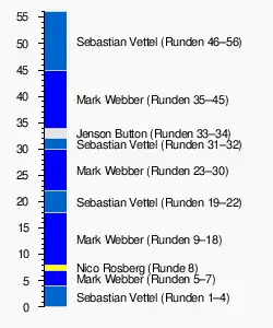 Nach den zweiten Boxenstopps verringerten sich die Abstände an der Spitze des Feldes. Vettel beschwerte sich über Funk, dass Webber zu langsam fahre und forderte Red Bull zu einer Stallorder auf.[12] Webber konterte jedoch mit schnelleren Runden, sodass sich das Duell der Red-Bull-Piloten zunächst erledigt hatte. Bei den dritten Boxenstopps der Spitzengruppe, die Hamilton in der 30. Runde begann, kam es zu einer Positionsverschiebung zwischen Vettel und Hamilton. Button, dessen Strategie einen Stopp weniger vorsah, lag inzwischen in Führung, wurde aber nach wenigen Runden von Webber überholt und ging anschließend an die Box. Dabei unterlief einem Mitglied der McLaren-Boxencrew ein Fehler, sodass das Haltesignal für 0,12 Sekunden fälschlicherweise auf grün sprang, obwohl das rechte Vorderrad nicht ausreichend befestigt war. Button, der auf das grüne Lichtzeichen reagiert hatte, fuhr los, hielt dann aber noch in der Boxengasse an, um sich zurück schieben zu lassen.[17] Button ging mit einer Runde Rückstand und außerhalb der Punkteränge zurück auf die Strecke. Er gab kurz vor Rennende an der Box auf.[13]