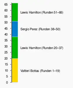 Verstappen versuchte den Undercut und stoppte in Runde 35, wobei er die harte Mischung verwendete, die sehr konkurrenzfähig zu sein schien. Bottas wartete eine Runde, kam vor dem Red Bull Racing-Piloten wieder auf die Strecke, wurde aber bereits in der dritten Kurve überholt. Kurz darauf stoppte auch Hamilton und schaffte es, seinen Vorsprung vor Verstappen zu behaupten. Pérez übernahm die Führung, ohne die Reifen gewechselt zu haben. Der Mexikaner blieb bis zur 50. Runde an der Spitze, dann überholte Hamilton ihn in der ersten Kurve ohne Probleme. In der folgenden Runde wurde Pérez zurück an die Box gerufen, um die Reifen zu wechseln und auf weiche Reifen umzusteigen. Der Brite führte mit fünf Sekunden Vorsprung auf Verstappen, 6,2 Sekunden auf Bottas und 32 Sekunden auf Pérez selbst. Dank der neuen Reifen fuhr Pérez jedoch nun die schnellste Runde.