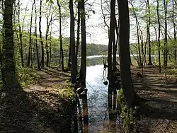 Durch die Wälder streifen Rehe, Schwarzwild und Füchse sowie seit den 2000er-Jahren zunehmend auch Marderhunde und die Neozoen Waschbären und Minks.[13] Unter den zu schützenden Säugetieren führt der FFH-Steckbrief den Fischotter und die Mopsfledermaus an.[11] Beide Tiere zählen laut Roter Liste in Brandenburg zu den vom Aussterben bedrohten Arten.[14] Über den Schutz der reichen Fledermausvorkommen im Naturpark informiert das nordöstlich des Sees gelegene Fledermaus-Museum Julianenhof. In der Amphibien-Biozönose nimmt das Vorkommen des Nördlichen Kammmolchs einen besonderen Stellenwert ein. Der Wassermolch aus der Ordnung der Schwanzlurche ist nach dem Bundesnaturschutzgesetz (BNatSchG) streng geschützt und auch die Fauna-Flora-Habitat-Richtlinie führt ihn im Anhang II als streng zu schützende Art, für die eigens Schutzgebiete auszuweisen sind.[15] In Brandenburg gilt er als stark gefährdet.[16]