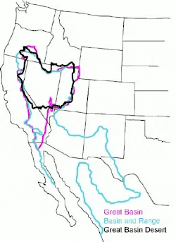 Das Große Becken ist ein Bruchschollengebirge, das nach Auffaltung der Kordilleren zuerst zu einem Hochplateau aufwuchs und später durch Spreizung der Kontinentalkruste entstandene Verwerfungen in Horste, Pultschollen und Gräben zerfallen ist. Heute besteht es aus einer sehr großen Zahl kleiner „Gebirgsinseln“, deren Abtragungsschutt von den benachbarten Senken aufgenommen wurde. Diese Senken bilden rund hundert einzelne Becken unterschiedlichster Größe, sodass der Name Großes Becken etwas irreführend ist.[1] Das Gebiet wird von Steppen, Stein- und Sandwüsten, meist trocken liegenden Bach- und Flussläufen, Canyons, Salzseen und -pfannen und einigen kleinen und großen Seen (zum Beispiel Großer Salzsee, Utah Lake und Pyramid Lake) geprägt. Im Norden des Großen Beckens verläuft der Humboldt River, der im Westen unter der Flanke der Sierra Nevada in kleinen abflusslosen Seen endet, in denen das Wasser in der Wüstenluft verdunstet.