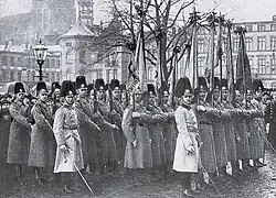 31. Dezember 1918 – Aus der 1.(Leib-)Kompanie und der 2. Kompanie des I. und III. Bataillons sowie aus der 3. und 4. Kompanie des II. Bataillons wurde ein Heimatschutz-Bataillon formiert, welches dem Befehl von Major von Brockhausen unterstand.[8]