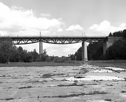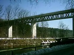 | Konstruktion Brücke | ursprünglich Fachwerk-Linsenträger, ab 1909 Halbparabelträger, jeweils mit oben aufliegender Fahrbahn |