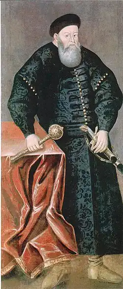Fürst Konstantin Ostroschski, erster Großhetman von Litauen, den Hetmansstab in der rechten Hand haltend (Gemälde aus dem 16. Jahrhundert)