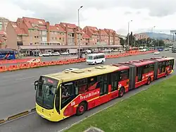 Die dritte Kategorie von Großraumbussen bilden die vergleichsweise jungen überlangen Gelenkbusse. Diese haben nur ein Gelenk und weisen zur besseren Wendigkeit und Gewichtsverteilung eine Doppelachse am hinteren Wagenteil auf, wovon die hintere aktiv mitlenkt. Die zusätzliche Achse hilft auch, durch ein höheres zulässiges Gesamtgewicht mehr Fahrgäste zu befördern.[3] Bisher sind Modelle mit Längen zwischen 19,5 und 21 m auf dem Markt,[20][21] womit sie sich ungefähr im Bereich der Midibuszüge bewegen. Auch hier geht jedoch die Kapazität über die von vergleichbar langen Buszügen hinaus. Da es sich hier um eine neuere Entwicklung handelt – das erste Probefahrzeug wurde im Jahr 2005 vorgestellt –, ist eine Festlegung auf den genannten Längenbereich nicht zwangsläufig.[21] Auch eine Veränderung der bisher im Bereich der Wenderadien von Doppelgelenkbussen liegenden Wendigkeit würde daraus vermutlich folgen. Eine Besonderheit stellen überlange Gelenkbusse beim Ausschwenkmaß dar. Bedingt durch die gelenkte Hinterachse werden bei starkem Lenkeinschlag Ausschwenkmaße des Hecks von 0,42 bis 1,49 m erreicht.[22][21]