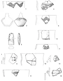 Bei der ersten Dokumentation der Anlage im Jahr 1976 wurden 71 teilweise tiefstichverzierte Keramikscherben der Trichterbecherkultur gefunden. Bei der Grabung von 2009 wurden weitere 873 Scherben gefunden. Wegen der starken Zerscherbung ließen sich nur eine Kragenflasche und eine flache Schale sicher rekonstruieren. Neben der Keramik wurden ein Feuerstein-Beil und 31 weitere Feuerstein-Artefakte (Klingen, Klingenkratzer, Schaber, Abschläge und eventuell Bohrer) entdeckt.