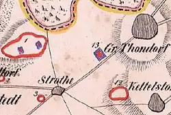 Grab 1 lag nordöstlich von Strothe, an der Westseite des Weges nach Groß Thondorf und gehörte vielleicht schon zu dieser Feldmark. Die Gräber 2 und 3 lagen nordwestlich von Strothe inmitten einer Gruppe von Grabhügeln.