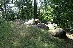 Ein kleiner Hügel, auf dem elf Steine liegen (neun Tragsteine, zwei Decksteine, davon einer verstürzt). Das westliche Joch mitsamt Schmalseitenträger der ehemals wohl 8 m × 1,6 m großen, nahezu West-Ost orientierten Kammer ist intakt erhalten. In situ stehen auf der nördlichen Langseite weitere zwei Träger, auf der südlichen ein weiterer Trägerstein, ebenso der Träger der östlichen Schmalseite.