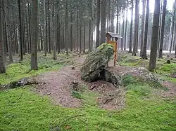 Erhalten sind drei Quarzitblöcke, zwei davon Tragsteine sowie ein in die Kammer gerutschter Deckenstein.
