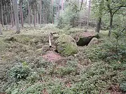 Die Anlage liegt heute in einem Grenzgraben und wurde bei dessen Bau wohl erheblich beschädigt. Eine Hügelschüttung lässt sich nicht mehr ausmachen. Die Grabkammer hatte wohl eine ost-westliche Orientierung und eine Länge von etwa sieben Metern. Zwei Wandsteine der nördlichen Langseite stehen wohl noch annähernd in situ, ebenso ein Wandstein der südlichen Langseite. Drei Decksteine sind erhalten. Einer von ihnen lehnt an den nördlichen Wandsteinen. Östlich neben diesem liegt ein weiterer im Inneren der Kammer. Am westlichen Ende der Kammer liegt der dritte, der wohl dorthin verschleppt wurde.
