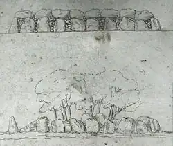 Rekonstruktion des ursprünglichen Aussehens und heutiger Zustand; Zeichnung von Ernst Sprockhoff (1926)