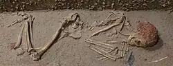Die Person war längs der östlichen Höhlenwand bestattet worden, 7 m hinter dem Eingang, in linker Seitenlage mit angewinkelten Beinen. Der Kopf wies nach Süden, das Gesicht nach Westen. Neben einem Kopfschmuck aus mehr als 300 gelochten Schneckengehäusen und Hirschzähnen waren Grabbeigaben in Form einer Knochenahle, zweier großer Silexklingen sowie weiterer Steinwerkzeuge beigelegt. Unterhalb des linken Kniegelenks befanden sich durchlochte Muscheln, die möglicherweise aufgefädelt als Beinschmuck getragen wurden. Es wird angenommen, dass der gesamte Leichnam mit Ocker bestreut worden war.