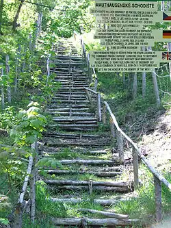 Die Verbindung zwischen Grube und höher gelegenem Lager stellte die sogenannte Mauthausener Stiege (Mauthausenské schody) her, eine drei Meter breite, und 230–260 Stufen lange Treppe. Die Treppe ist sehr steil und war zu Zeiten des Zwangsarbeiterlagers durch diverse Sicherungsmaßnahmen wie Zäune und Tore an beiden Enden gegen Ausbruchsversuche gesichert. Den Namen erhielt sie, zu nicht eingrenzbarem Zeitpunkt, durch ehemalige Häftlinge des KZ Mauthausen in Erinnerung an dort erlittene Qualen.[31] Die Treppe ist noch heute erhalten.