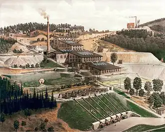 Hauptschacht der Grube Lüderich mit Maschinenhaus 1902, das Wasser wird für die Aufbereitung in einen Hochbehälter gepumpt