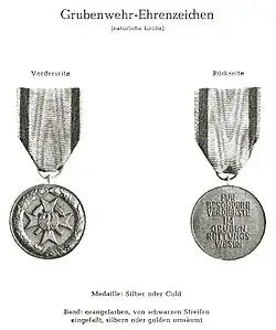 - ↑ Durchführungsbestimmungen zum Erlass über die Stiftung des Grubenwehr-Ehrenzeichens vom 14. Juli 1953, Bundesgesetzblatt Nr. 39 vom 24. Juli 1953, § 3 und 4 der Durchführungsbestimmung