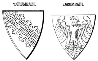 Der Stammsitz der Grumbach war das Dorf Burggrumbach bei Unterpleichfeld.[1] Ein Eben von Grumbach wird nach Seyler schon um 1000 erwähnt.[2] Die älteste urkundliche Erwähnung der Edelfreien von Grumbach stammt aus dem 11. Jahrhundert. Im Jahr 1099 taucht Markward I. von Grumbach als Vogt des Klosters Schlüchtern und ein Jahr später als Vogt des Klosters Neustadt am Main auf. Sein Sohn Markward II. ließ vor 1148 die Burg Rothenfels erbauen.[3] Er war treuer Gefolgsmann der Staufer und nahm 1156 an der Hochzeitsfeier Friedrich Barbarossas in Würzburg teil.[4] Markward III. wurde 1164 von Kaiser Barbarossa zum Statthalter der Lombardei ernannt. Im Jahr 1243 starb die Familie im Mannesstamme mit Albert, Herr zu Rothenfels, aus. Ihre aus einem Burgmannengeschlecht, das im Dienst der Edelfreien von Grumbach gestanden hatte, stammenden Nachfolger nannten sich ebenfalls „von Grumbach“. Die Besitzungen gingen durch Bischof Gottfried III. 1317 auf den Grafen Ludwig V. von Rieneck († 1333)[5] über, der mit der Tochter Alberts, Adelheit (Udelhilt), verheiratet war.