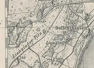 | Karte von 1893, mit dem Grundlosen See am Ende des Namenszuges Lienzinger Filz | ||