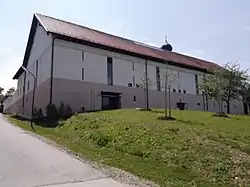 Lange Zeit wurde als Schulhaus ein nach jüngsten Schätzungen um 1834 (Dachstuhl bezeichnet 1879) errichteter Dreiseithof genutzt, der bis 1902 als Pfarrstadel dem wirtschaftlichen Unterhalt der Pfarrer und nach der Nutzung als Schulhaus im Zweiten Weltkrieg als Luftschutzbunker diente.[22] Er fand bereits ab 1902 keine Verwendung mehr als Wirtschaftsgebäude in der Pfarrei.[23] Der Abbruch des danach verfallenen Baus wurde gestoppt und das dann unter Denkmalschutz gestellte Gebäude von 1991 bis 1993 zur Unterbringung eines Kindergartens im Westflügel saniert. Nach einer weiteren Sanierung des restlichen Gebäudeteils von Mai 2015 bis Ende 2017 dient dieser dem Pfarrverband Glonnauer Land im Dekanat Fürstenfeldbruck als Pfarrheim.[22][24][25]