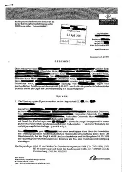 In der beiliegenden Datei (Bescheid Grundverkehrskommission) ist eine solche Entscheidung der oberösterreichischen Grundverkehrskommission für den Bezirk Braunau zu sehen. Darin sind unter anderem enthalten: das betreffende Grundstück (geschwärzt); die entscheidende Kommission; die Auflage, unter der das Rechtsgeschäft genehmigt wird sowie eine einzuhaltende Frist für die Auflage.