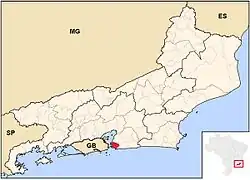 Lage des Bundesstaates Guanabara (GB) auf der Karte des Bundesstaates Rio de Janeiro mit dessen Hauptstadt Niterói in Rot | ||||||||