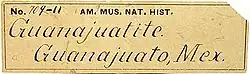 «He dado el nombre de Guanajuatita á un mineral de Bismuto de la Sierra de Santa Rosa de este Mineral, que hace dos anos me fué presentado por primera vez por el jovén estudiante de Quimica en aquella época, D. Vicente Gomez Couto. Le he dado un nombre particular porque es una especie nueva, siguiendo en esto la costumbre de los mineralogistas y he elegido eses nombre parasignificar en él lugar de la procedencia del mineral.»