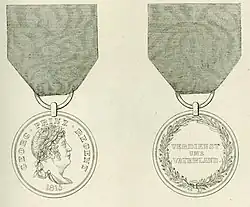 Die Ordensdekoration war eine silberne Medaille mit dem Brustbild des Stifters auf der Vorderseite und der Umschrift „GEORG PRINZ REGENT“. Die Rückseite mit der Inschrift „VERDIENST UMS VATERLAND“ hatte eine für den Träger persönliche Gravur. Am Rand umlaufend war der Vor- und Zuname des Geehrten graviert.