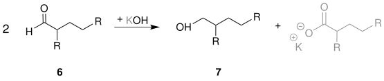 Abschließend wird in einer Cannizzaro-Reaktion durch Reaktion zweier Moleküle des Aldehyds 6 mit einem Hydroxid-Ion unter Abspaltung eines Carboxylat-Ions (grau) der Alkohol 7 (Guerbet-Alkohol) synthetisiert:[6]
