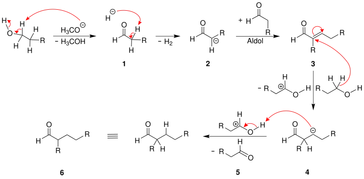 Zunächst wird ein primärer Alkohol (alternativ: sekundärer Alkohol) deprotoniert. Dadurch bildet sich an dieser Stelle eine Carbonylgruppe aus und das Wasserstoffatom der Hydroxygruppe wird als Hydrid-Ion abgespalten. Dieses Hydrid-Ion deprotoniert den entstandenen Aldehyd 1 in α-Position, ein Wasserstoffmolekül wird abgespalten und es entsteht der in α-Position deprotonierte Aldehyd 2. Auf weitere mesomere Grenzstrukturen (Hinweis: Keto-Enol-Tautomerie) wurde zwecks besserer Übersicht verzichtet. Durch eine Aldolkondensation dieses Ions 2 mit dem Aldehyd 1 entsteht das Alkenal (α,β-ungesättigter Aldehyd) 3. Durch Addition eines Hydrid-Ions in α-Position entsteht eine negative Ladung am β-Kohlenstoffatom des Alkenals 3. An dieser Stelle wird anschließend ein Proton addiert. So entsteht der Aldehyd 6.[6][7] Dabei entsteht außerdem der Aldehyd 5, der identisch ist mit dem Aldehyd 1 und ebenfalls eine Aldolkondensation mit dem Anion 2 eingehen kann.