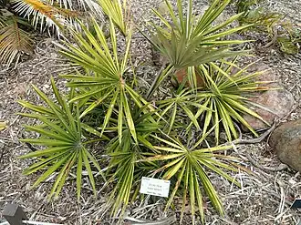 Die Blätter sind reduplicat, fächerförmig und vertrocknen an der Pflanze (Marzeszenz). Die Blattscheiden zerfallen in eine Masse von verwobenen, groben, schwarzen, stachelartigen Fasern oder in ein zungenförmiges Netz von groben, flachen Fasern. Der Blattstiel ist mäßig lang, unbewehrt, mit scharfen Rändern und wollig behaart. Die Hastula auf der Oberseite ist rundlich, kahl oder mit wolligem Haar besetzt. Die Blattspreite ist kreisrund oder keilförmig. Sie ist auf 3/4 bis 4/5 des Radius geteilt in rund 20 linealische, einfach oder selten doppelt reduplicat gefaltete Segmente. Die Ränder der Segmente sind gezähnt oder glatt. Die Oberseite der Spreite ist dunkelgrün und kahl mit Ausnahme von Schuppen entlang der Blattrippen. Die Unterseite ist dicht mit silbernen wolligen Haaren besetzt oder auch kahl.