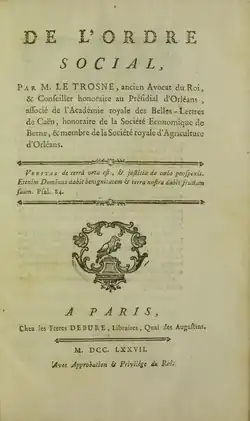 - De l’ordre social, ouvrage suivi d'un traité élémentaire sur la valeur, l’argent, la circulation, l’industrie & le commerce intérieure & extérieur. Paris 1777.