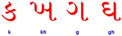 | Velar | ક | ka | ખ | kha | ગ | ga | ઘ | gha | ઙ | ṅa | |||||||||||