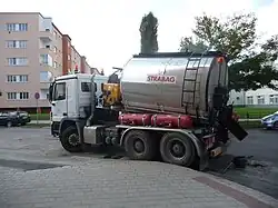 - Liegende, horizontale Gussasphaltkocher: Da hier der Kocher auf dem Fahrgestell „liegt“, kann die gesamte Länge der Ladefläche des Fahrzeuges genutzt werden. Daher eignen sich für diesen Aufbau auch große Sattelauflieger, wobei Kapazitäten bis zu 12.000 Liter möglich sind.[2] Die Rührarme bzw. Rührwellen müssen horizontal angebracht werden. Da sie bei dieser Variante im Bereich des heißen Gussasphalts liegen, müssen sie mit speziellen, temperaturbeständigen Stopfbuchsen sorgfältig abgedichtet werden. Um die Einfüllklappe sicher erreichen zu können, haben horizontale Gussasphaltkocher in der Regel eine fest montierte Leiter und ein kleines Podest.