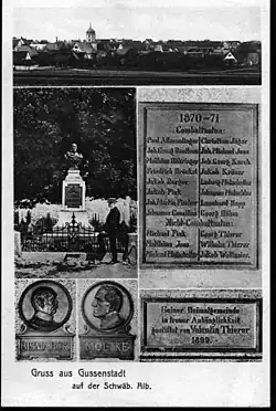 An der linken und rechten Seite des Sockels sind die Reliefmedaillons von Bismarck und Moltke angebracht. Eine Inschrifttafel auf der Rückseite nennt die Namen sämtlicher Kriegsteilnehmer von 1870/71 der Gemeinde Gussenstadt.